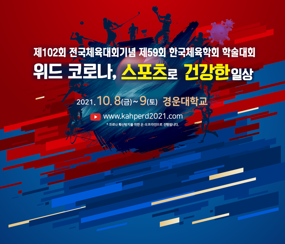2021년도 제102회 전국체육대회를 기념하며 제59회 한국체육학회 및 분과학회 학술대회가 개최됩니다. 이번 학술대회는 비대면 온라인 방식으로 진행됩니다. 자세한 사항은 한국체육학회 홈페이지에서 확인 바랍니다. 회원 여러분의 많은 관심 부탁 드립니다.