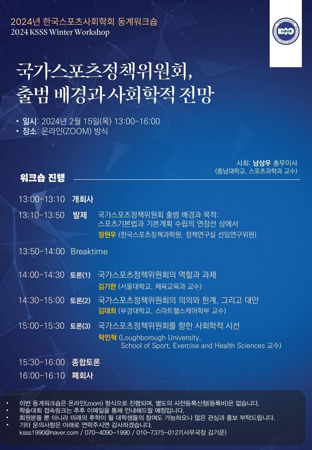 올해 우리 학회의 첫 사업인 「2024년도 한국스포츠사회학회 동계워크숍」이 다가오는 2월 15일(목)에 비대면 온라인(Zoom)형식으로 개최될 예정입니다.