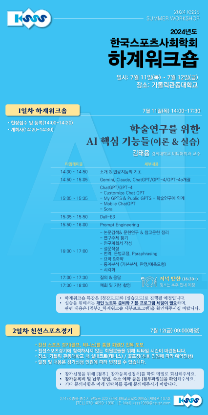 이번 하계워크숍은 경희대학교 미디어학과 김태용 교수님을 모시고, "학술연구을 위한 AI 핵심기능들(이론과 실습)" 이라는 주제로 인공지능 AI 시대, 스포츠사회학 분야에 적용가능한 새로운 연구방법론을 배워볼 수 있는 '배움의 장'을 마련하였습니다.